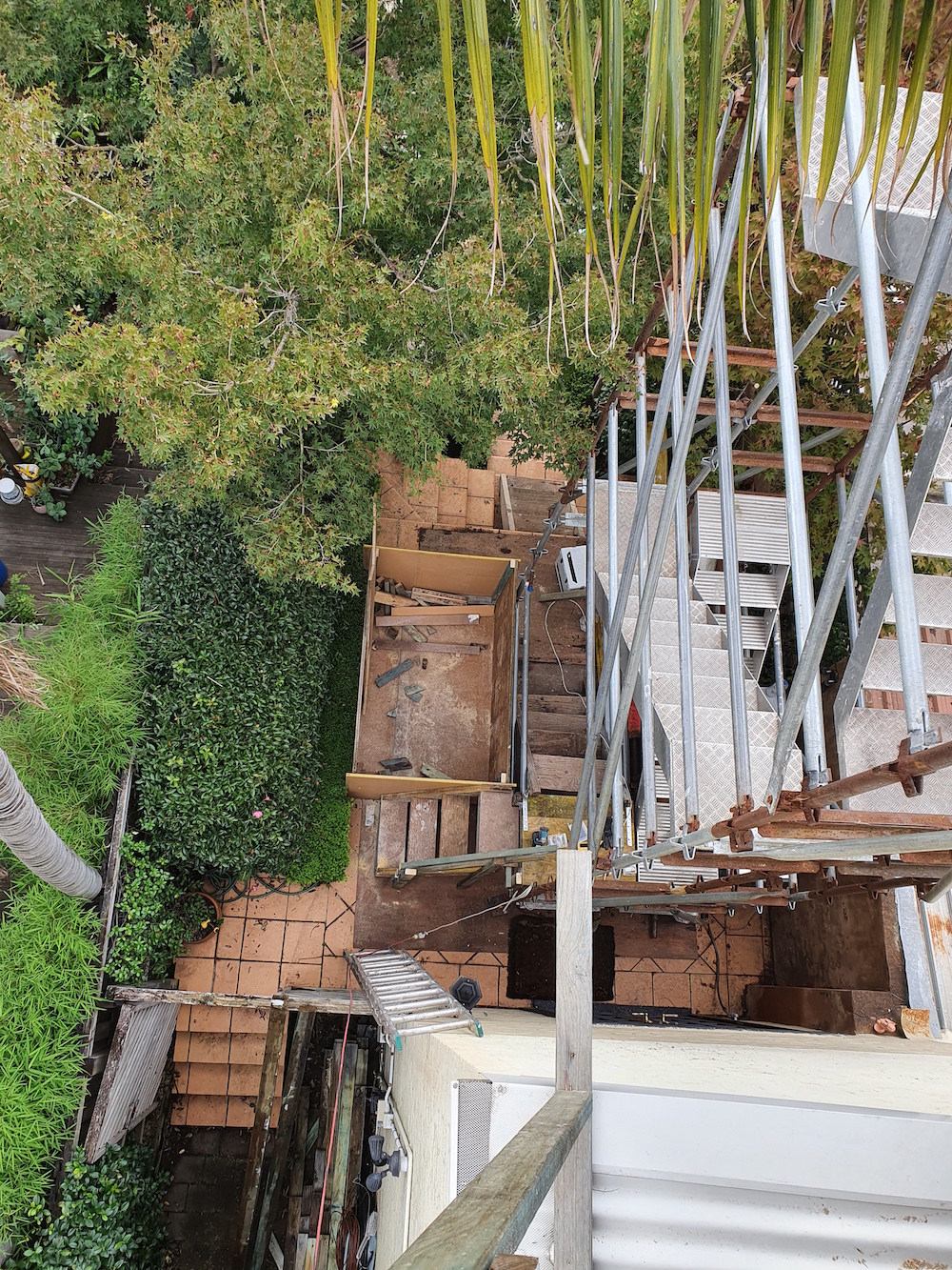 An understated plus of Martyn’s building approach is the workers’ entrance into the roof space via an external scaffold and work platform rather than through the house. This reduced the interactions, mess and noise from the house until the house was opened for the construction of the staircase